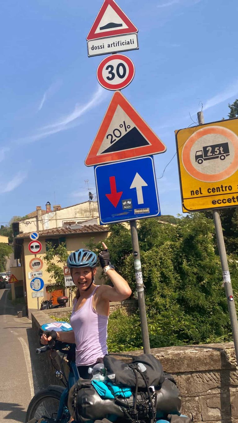 Maar… we moeten nog naar de camping en die ligt boven Florence. Na een twee wijntjes zakt de moed je in de schoenen als je plotseling een bordje 20% tegenkomt. Na een pittige duw- en trekpartij zijn we op de grotere weg naar Fiesole aangekomen. Ook hier een tegenvaller: de foute naar boven is een onderdeel van het WK Wielrennen2013. Hier begint de klim richting Fiesole. Je klimt hier over een afstand van ongeveer 4,5 km met een gemiddeld stijgingspercentage van 5% naar boven.