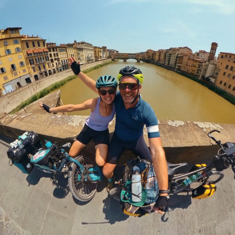 De laatste etappe van de route gaat naar Florence. Prachtige kilometers met leuke dorpjes. Bijna op het eind zie je stad in de verte liggen met de daken van de Dom direct zichtbaar. We slingeren mee met de Arno en we weten dat dit het einde van een geweldige route gaat worden. Op de Ponte Vecchio geven we elkaar een dikke zoen: we zijn er! Wat een prachtige route en wat hebben we veel gezien. En op de fiets door Florence, hoe leuk kan je het hebben. Tijd voor een lekkere pasta met wijn.